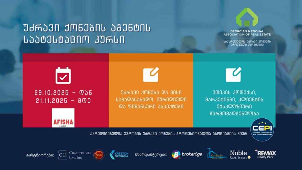 რე/მაქს რეალთი პარკი აქტიურად არის ჩართული საქართველოს უძრავი ქონების ეროვნული ასოციაცია -ის საქმიანობაში. ჩვენთვის განსაკუთრებულად მნიშვნელოვანია საბროკერო სფეროში დასაქმებული პირების პროფესიული განათლების ხელშეწყობა. სწორედ ამიტომ, უძრავი ქონების აგენტებს გირჩევთ, გაიაროთ ასოციაციის მიერ ორგანიზებული „აგენტების საატესტაციო კურსი“, რომელიც ევროპის უძრავი ქონების პროფესიათა ასოციაციის მიერ არის ატესტირებული. აღსანიშნავია, რომ ტრენერებს შორის იქნება ჩვენი გუნდის წარმომადგენელიც – მარიამ სურგულაძე, „რე/მაქს […]